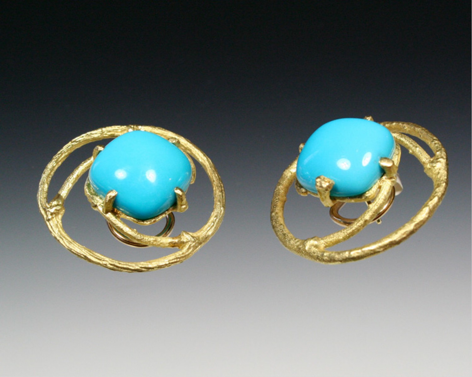 Turquoise from Lightning Ridge, Arizona is a vibrant blue hue, set off by the matte finish of the 18K gold twigs.