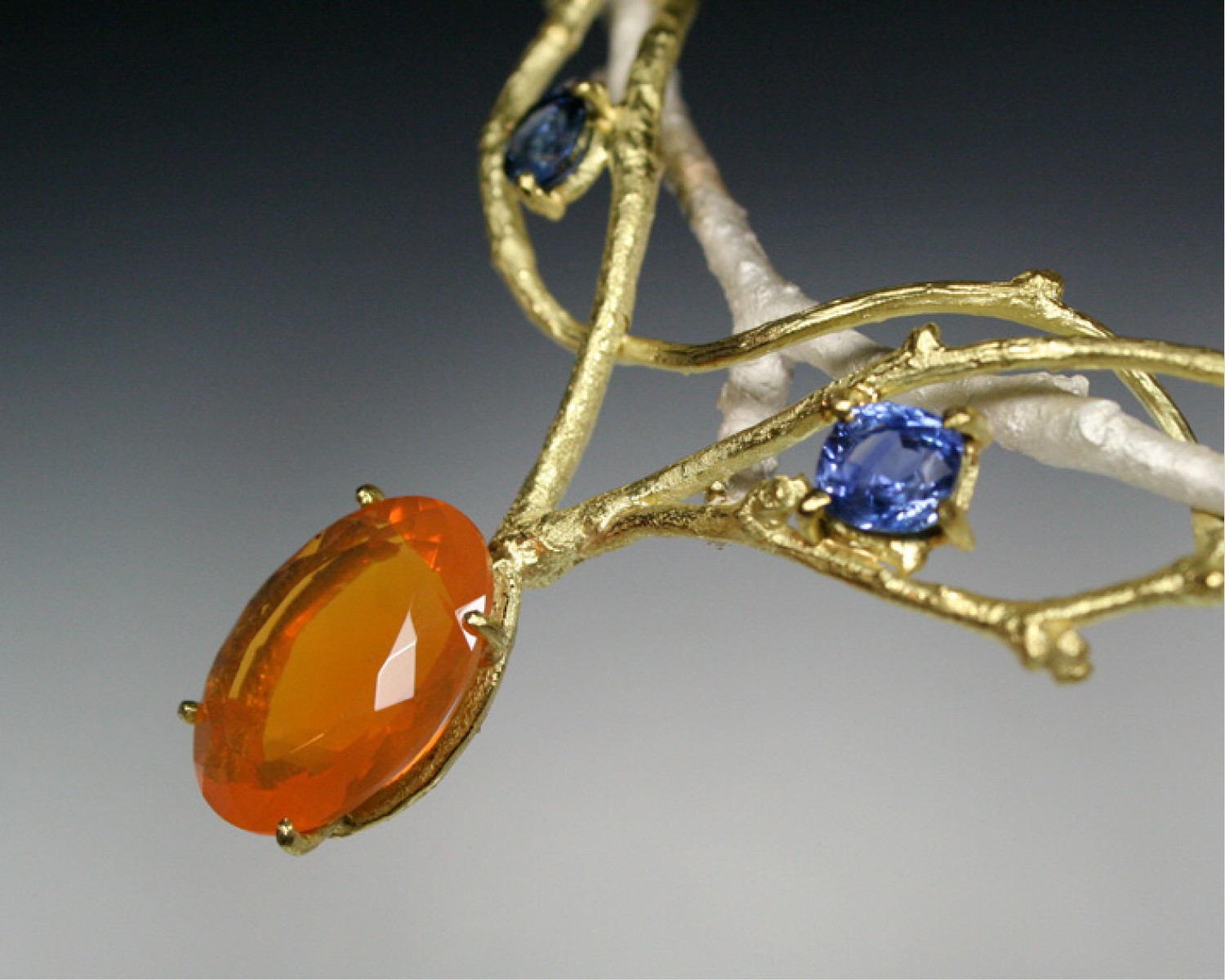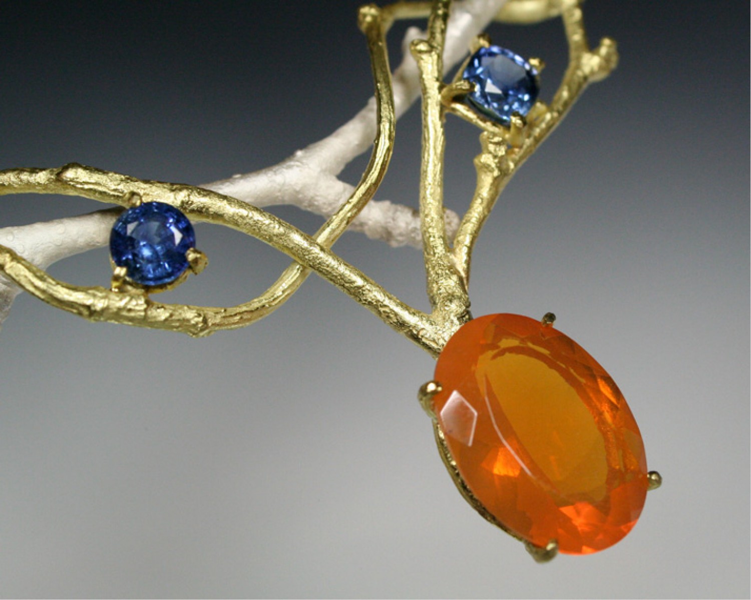 Extraordinary twig neckpiece in 18K gold and sterling silver with intense orange fire opal from Mexico and brilliant ceylon sapphires. Gold weaving is dimensional and swirls around silver core. 11.25cts of sapphires.